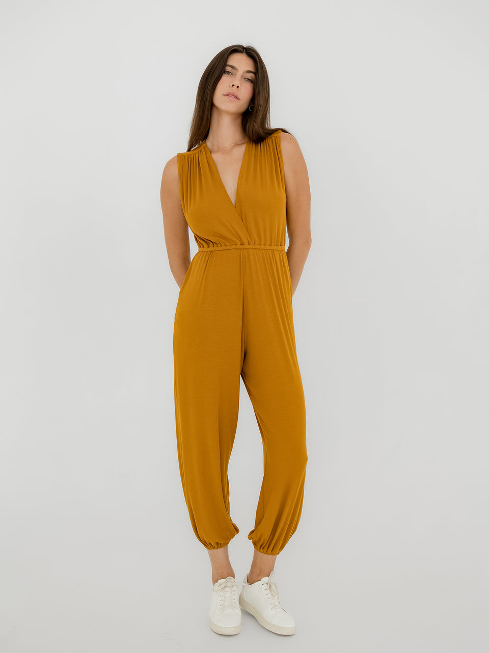 Crafted from 95% Ribbed LENZING™ MicroModal and 5% Spandex, the jumpsuit feels airy and soft against the skin while maintaining enough stretch for yoga, lounging, or running errands. The plant-based fabric breathes with you, keeping you cool and cozy regardless of activity. Whether layered with a jacket for cooler days or worn solo for a minimal, elegant look, the Ribbed Mustard Shira Jumpsuit is a versatile essential that transitions seamlessly from mat to marketplace.
