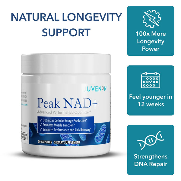 We all want to stay youthful, energetic, and sharp, but ageing often brings the opposite. Fortunately, science now understands much more about how to slow the aging process at a cellular level. PEAK NAD+ is designed with that exact purpose in mind. This advanced supplement helps recharge your cells from within by increasing NAD+ levels, a vital molecule for energy, cell repair, and metabolic function. While most NAD+ supplements provide mild benefits, this supplement is 100 times more potent than average, giving your body serious longevity power. This formula can support clearer thinking, deeper sleep, more strength, and faster recovery by helping your cells repair damage, boosting your energy production, and improving DNA health. It even helps your body burn more fat by improving how efficiently your cells use energy. It is not just about living longer; it is about feeling stronger and more alive every day. This supplement gives you the tools to do both.