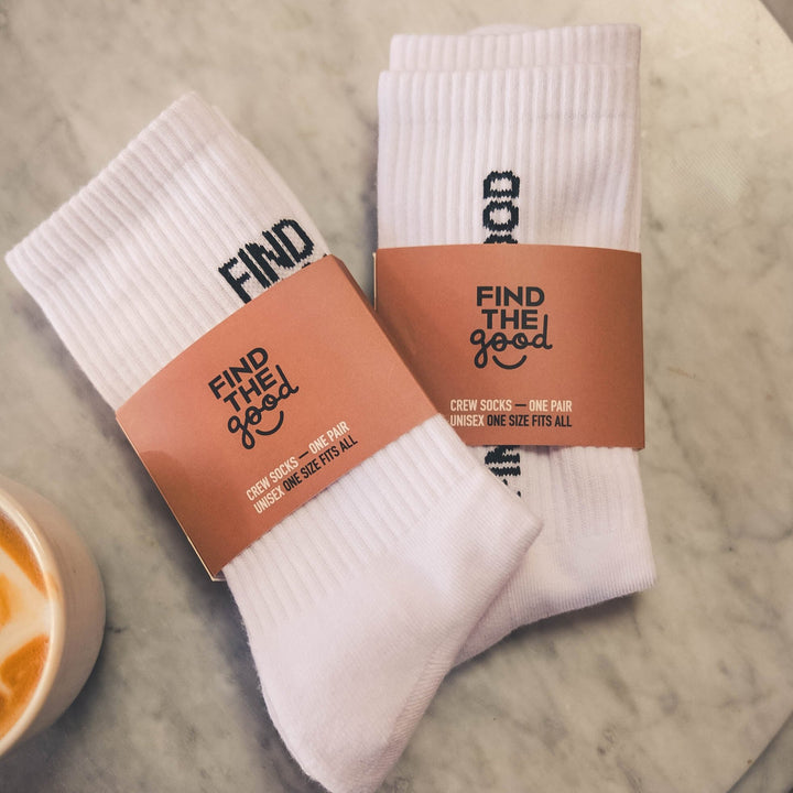 Subtle branding near the cuff reminds you to “Find The Good”—a mantra that doesn’t scream, but gently whispers as you move through your day. Paired with sneakers or peeking out from ankle boots, these socks add a grounding element to your look—and your mindset.